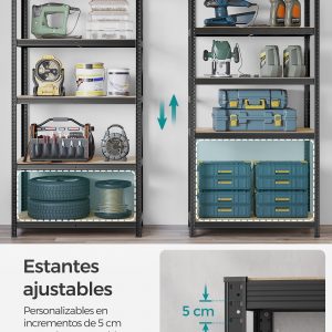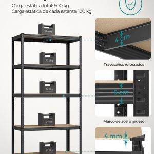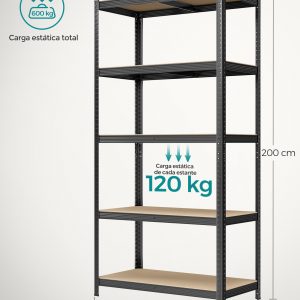 Gran Capacidad de Carga: Con dimensiones de 50 x 100 x 200 cm y una capacidad total de carga de 600 kg, esta estantería es ideal para almacenar artículos pesados en el garaje, almacén o trastero.