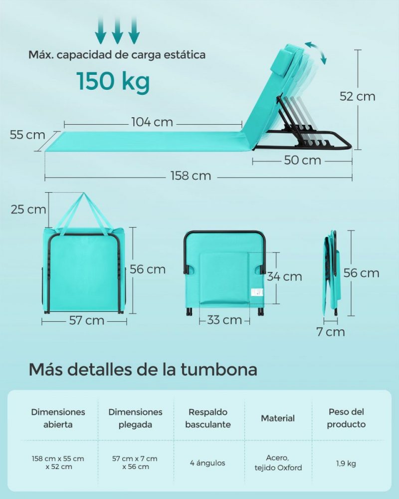 Máx. capacidad de carga estática de cada tumbona: 150 kg
