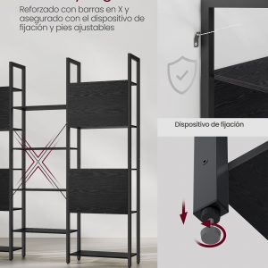 Los estantes con panel posterior aseguran que tus objetos de valor no se caigan; los pies ajustables mantienen la estantería uniforme; el dispositivo de fijación evita que la estantería vuelque, ofreciendo un entorno más seguro.