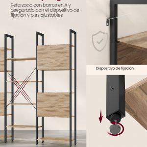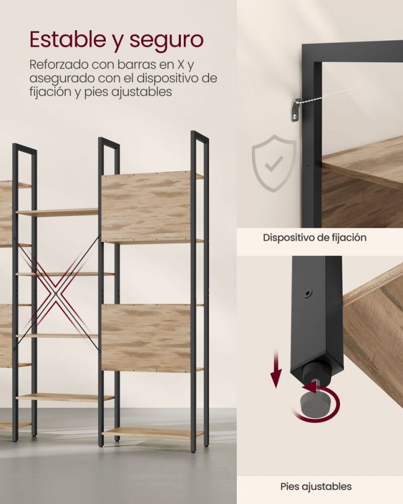 Los estantes con panel posterior aseguran que tus objetos de valor no se caigan; los pies ajustables mantienen la estantería uniforme; el dispositivo de fijación evita que la estantería vuelque, ofreciendo un entorno más seguro.