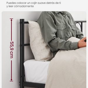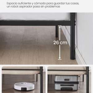 Espacio de Almacenamiento Amplio: Ofrece un amplio espacio de 26 cm de altura entre el suelo y las barras de la cama, perfecto para deslizar cajas de almacenamiento y facilitar la limpieza, permitiendo incluso el acceso de robots aspiradores.