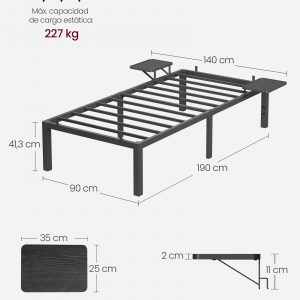 Este ingenioso diseño no solo ofrece una cama estable y robusta, sino que también incorpora dos estantes montados directamente en la cama, perfectos para sustituir las mesillas de noche y mantener tus objetos esenciales al alcance. Con un amplio espacio debajo de la cama, es ideal para almacenar cajas y permite el paso del robot aspirador, facilitando la limpieza.