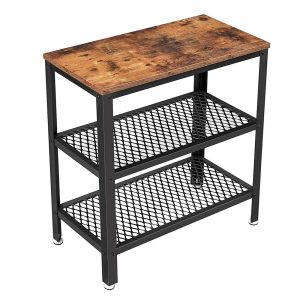 Equipada con una superficie en tono marrón rústico y dos robustos estantes de rejilla, esta mesa no solo es una pieza decorativa sino también una solución de almacenamiento excepcional. Ofrece tres niveles para organizar libros, accesorios de TV, elementos decorativos o plantas, maximizando el uso del espacio vertical de manera elegante.
