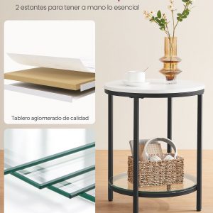 Diseñada pensando en la longevidad, esta mesa cuenta con patas de acero robustas, un tablero de aglomerado de alta calidad y un estante de cristal templado, garantizando un soporte estable y confiable. Con patas ajustables para equilibrar en superficies irregulares, cada estante soporta hasta 10 kg, prometiendo resistencia y durabilidad en el uso diario.