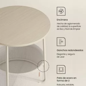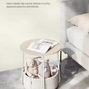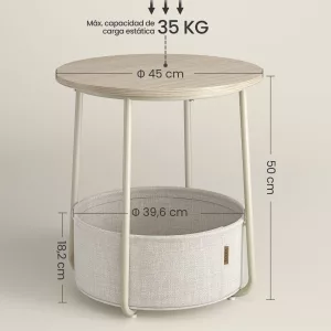 Adecuada para Espacios Pequeños: Con dimensiones de 45 x 50 cm para la mesa y una cesta de 39,6 x 18,2 cm, esta mesa es ideal para espacios reducidos. Funciona perfectamente como mesa auxiliar en el salón o como mesita de noche en el dormitorio, proporcionando mucho espacio para tus artículos esenciales.