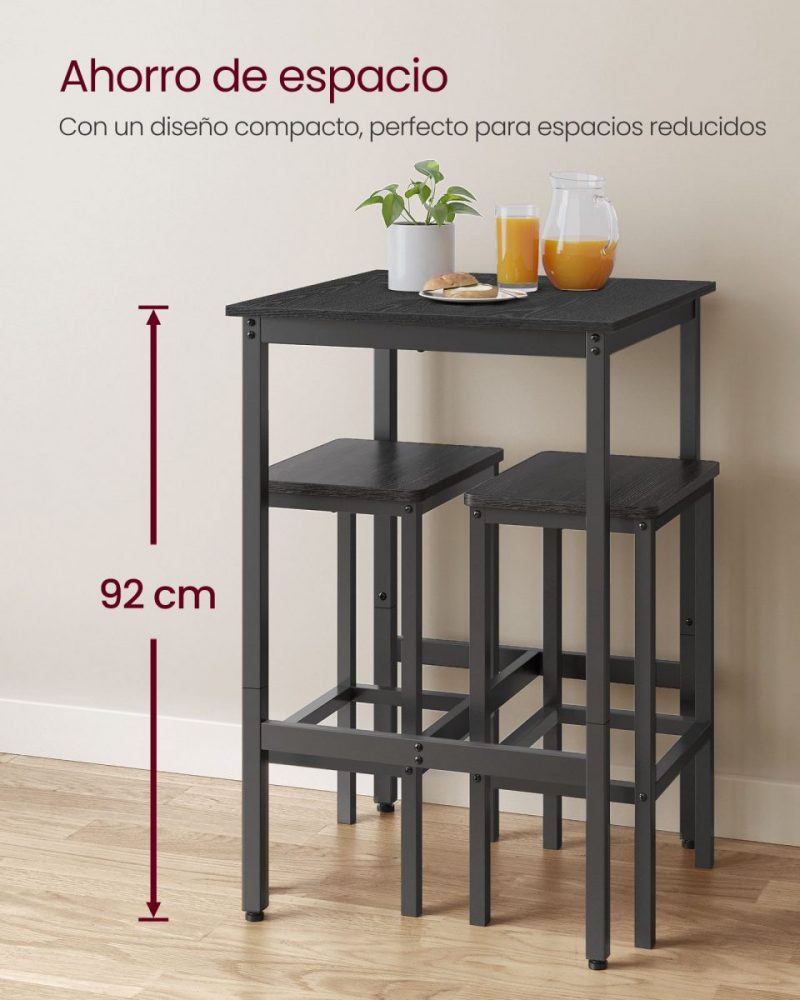 El diseño limpio y el estilo industrial de la mesa aportan un toque rústico a tu espacio. Además, se recomienda complementarla con taburetes de bar (no incluidos) de aproximadamente 61-66 cm de altura, que encajarán perfectamente debajo de la mesa, proporcionando una solución completa para tu área de comedor.