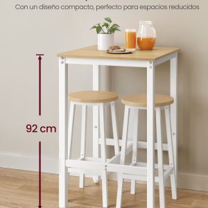 El diseño limpio y el estilo industrial de la mesa aportan un toque rústico a tu espacio. Además, se recomienda complementarla con taburetes de bar (no incluidos) de aproximadamente 61-66 cm de altura, que encajarán perfectamente debajo de la mesa, proporcionando una solución completa para tu área de comedor.