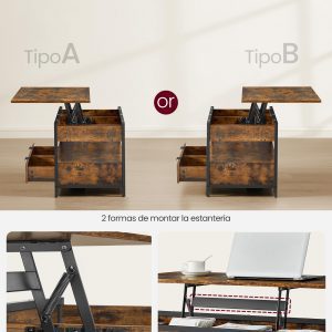 Mesa centro elevable, almacenamiento, cajones, marrón rústico y negro tinta