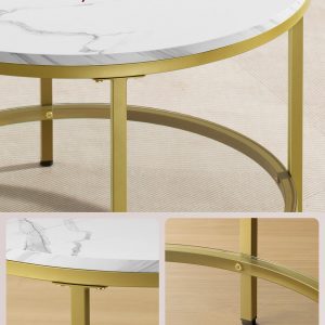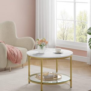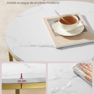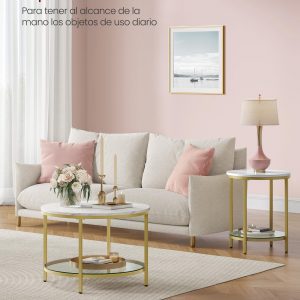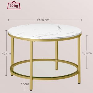 Mesa centro redonda imitación mármol, estante vidrio, 65×46 cm, blanco mármol y dorado claro