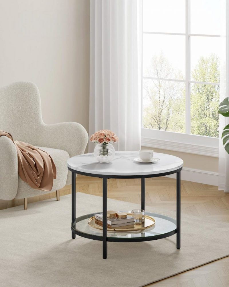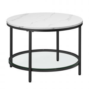 Eleva el estilo de tu sala de estar con nuestra mesa de centro, una pieza que encarna la esencia del diseño moderno minimalista. Con su elegante superficie de blanco mármol, estante de vidrio templado y patas de acero negro, esta mesa es la fusión perfecta de belleza y practicidad, diseñada para complementar tu vida exquisita.
