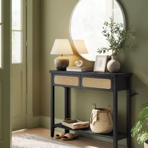 Dale a tu hogar un toque especial con esta mesa de consola que emana un encanto bohemio. Con su diseño inspirado en la naturaleza y detalles en ratán, es la pieza perfecta para añadir un aire fresco y orgánico a cualquier espacio.