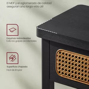 Estilo y Materiales: Un hermoso tono de Beige Roble combinado con MDF, aglomerado y ratán de PVC para un look natural.