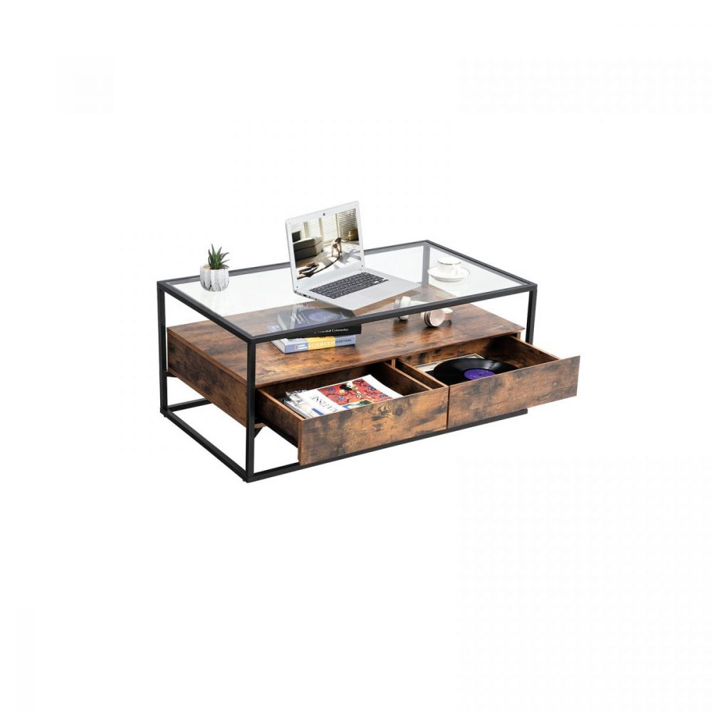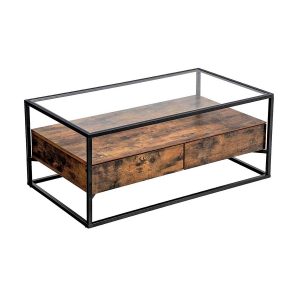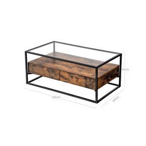 Esta mesa de centro aúna elegancia y funcionalidad con su diseño único que combina un marco de hierro negro, una superficie de cristal transparente y un estante de madera rústica. Perfecta para cualquier sala de estar, ofrece no solo una amplia superficie, sino también un almacenamiento conveniente con su estante y dos cajones integrados. Con su construcción robusta y detalles pensados para proteger tu suelo, esta mesa es tanto un elemento decorativo como una pieza práctica para tu hogar.