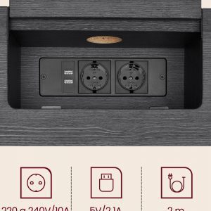 La regleta de enchufes, estratégicamente oculta en un compartimento fácilmente accesible, y el orificio de gestión de cables en la parte posterior, aseguran un espacio de trabajo limpio y libre de desorden. Esta funcionalidad se combina con un diseño elegante para ofrecer una mesa de almacenamiento que no solo es práctica sino también un complemento decorativo para cualquier habitación.