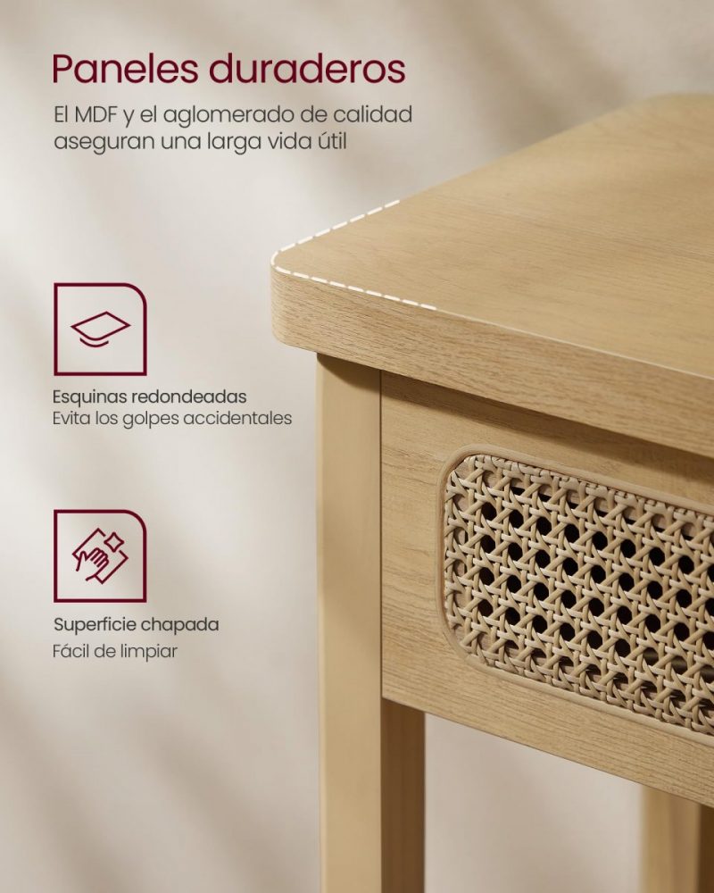 Estilo y Materiales: Un hermoso tono de Beige Roble combinado con MDF, aglomerado y ratán de PVC para un look natural.