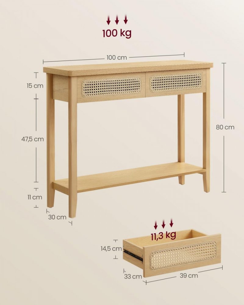 Dale a tu hogar un toque especial con esta mesa de consola que emana un encanto bohemio. Con su diseño inspirado en la naturaleza y detalles en ratán, es la pieza perfecta para añadir un aire fresco y orgánico a cualquier espacio.