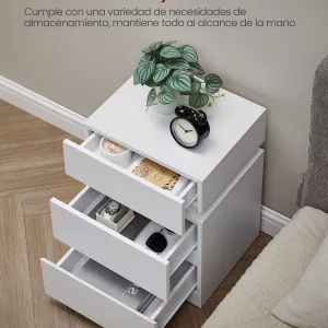 Gran Capacidad de Almacenamiento: Con 3 amplios cajones y una generosa encimera, esta mesita de noche te ofrece espacio suficiente para mantener tu área de descanso ordenada. Guarda tus periódicos, revistas y otros artículos personales en los cajones, mientras que la encimera es perfecta para un despertador, marcos de fotos y más.