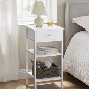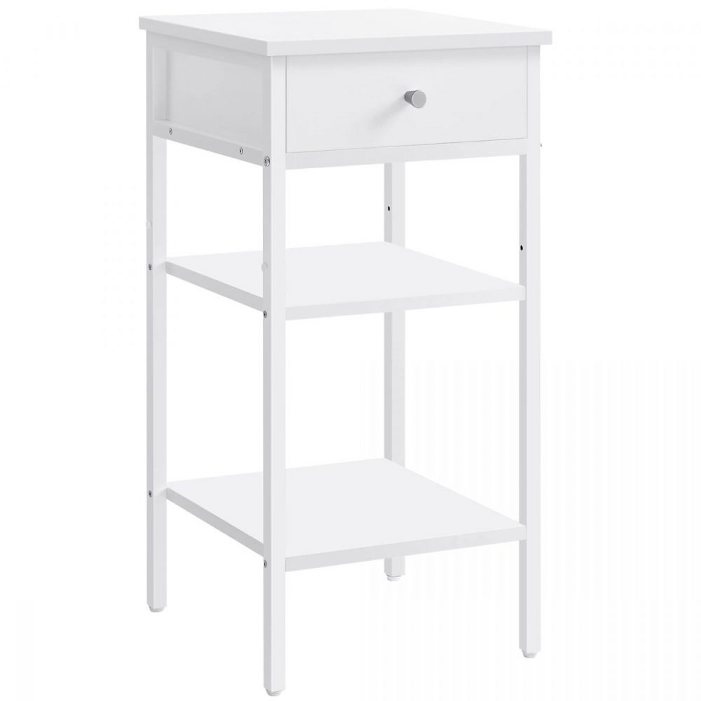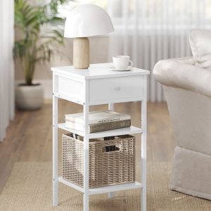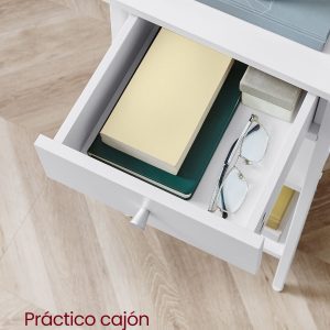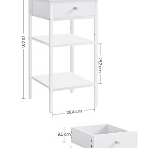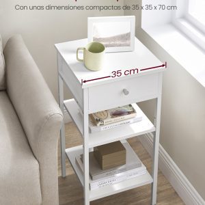 Diseño Atractivo y Espacioso: Con un cajón y dos estantes abiertos, esta mesita no solo es un complemento estético para tu habitación, sino que también proporciona un espacio generoso para organizar tus esenciales, desde lámparas y libros hasta decoraciones.