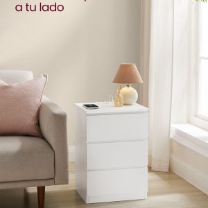 Además de su funcionalidad avanzada, esta mesita de noche ofrece amplio espacio de almacenamiento con su tablero espacioso y 3 cajones de fácil apertura con frentes biselados. Ya sea que quieras esconder tu última lectura o mantener las gafas a mano para la noche, esta pieza ofrece la solución perfecta para mantener tu espacio ordenado y tus esenciales al alcance.