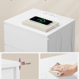 Transforma tu habitación en un santuario de comodidad y conveniencia con nuestra Mesita de Noche, diseñada meticulosamente para aquellos que valoran tanto la funcionalidad como el estilo. Equipada con una regleta de enchufes que incluye 2 tomas de CA y 2 puertos USB, así como un cable de 2 metros, esta mesita de noche te permite cargar todos tus dispositivos esenciales, desde el teléfono y la tableta hasta la lámpara y el ordenador, directamente desde la comodidad de tu cama.