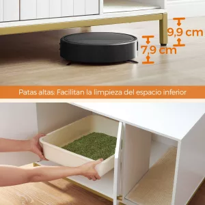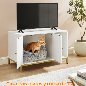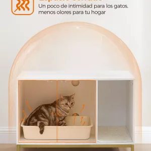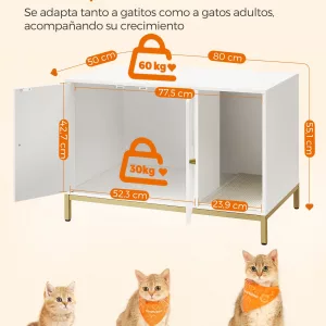 Con su diseño moderno, que combina una superficie blanca con un marco de metal dorado, este mueble no solo oculta la caja de arena, sino que también añade un toque de sofisticación a cualquier habitación. Este armario es la solución perfecta para mantener la estética de tu hogar mientras proporcionas a tu gato un espacio privado y acogedor.
