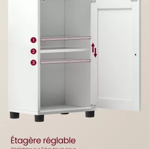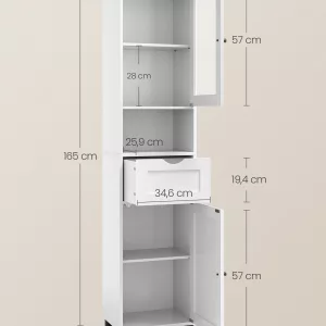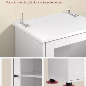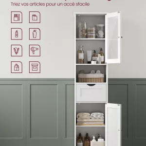 Este mueble de baño no solo añade un toque de frescura y elegancia a tu espacio con su acabado en Blanco Nube y puertas de cristal, sino que también maximiza el almacenamiento de manera eficiente. Equipado con un compartimento abierto, un cajón y estantes ajustables, este armario es perfecto para organizar desde utensilios de uso frecuente hasta toallas y productos de diferentes tamaños. Los pies de plástico robustos y resistentes al agua elevan el mueble, protegiéndolo de la humedad del suelo.