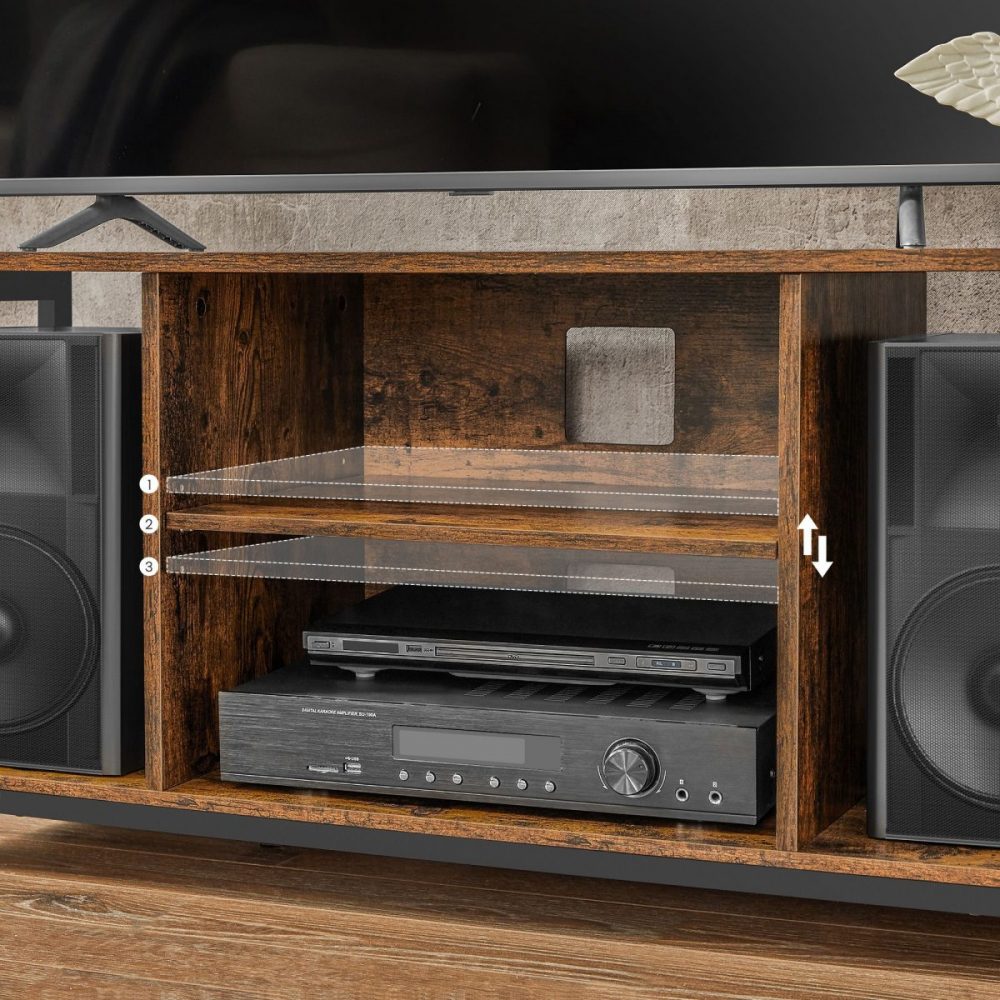 Diseño Versátil y Elegante: Con su acabado en marrón rústico y negro, este soporte de TV aporta un estilo industrial que complementa cualquier decoración, desde la moderna hasta la más tradicional.