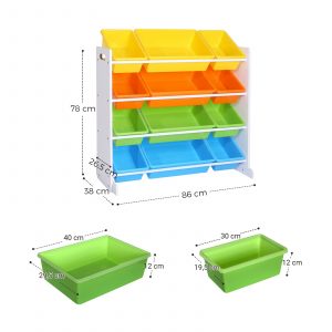 Nuestra estantería cuenta con 12 cajas en 2 tamaños diferentes y 4 colores vibrantes, que pueden combinarse libremente para crear un ambiente estimulante en el cuarto de los niños. Esta diversidad cromática no solo decora el espacio, sino que también hace más atractiva la organización de juguetes, libros y materiales de arte.