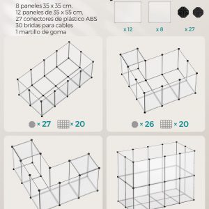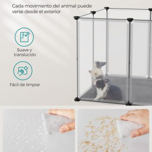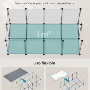 Espacio Amplio y Seguro: Con paneles lisos de 55 x 35 cm y 35 x 35 cm, este recinto ofrece una amplia área de juego minimizando las posibilidades de escape, perfecto para la actividad diaria de tus mascotas.
