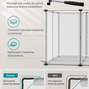Diseño Preventivo: La base del parque mejora la estabilidad y protege tu suelo, mientras que las conexiones sólidas entre los paneles previenen que los animales pequeños puedan escarbar y escaparse.
