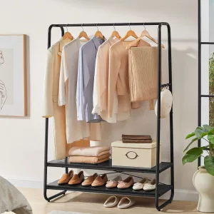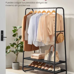 Capacidad de Almacenamiento Amplia: Cuenta con un riel superior de longitud completa para colgar chaquetas, camisas y pantalones. Dos estantes de almacenamiento ofrecen espacio adicional para bolsos, zapatos y cajas, mientras que los ganchos laterales son perfectos para sombreros, bufandas y paraguas.