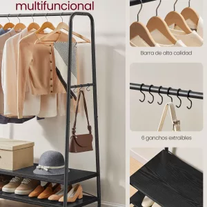 Este elegante perchero no solo sirve para colgar tu ropa sino que también actúa como una pieza decorativa en tu hogar. Con su diseño abierto y rústico, ofrece un acceso fácil y atractivo a tus prendas, zapatos y accesorios, lo que te permite mostrar tus artículos en lugar de esconderlos en un armario.