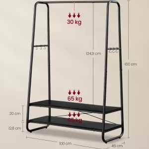 Construcción Resistente y Duradera: Fabricado con acero de alta calidad y tablero de aglomerado, este perchero es lo suficientemente robusto para soportar hasta 170 kg en total, asegurando que pueda manejar una carga pesada sin problemas.
