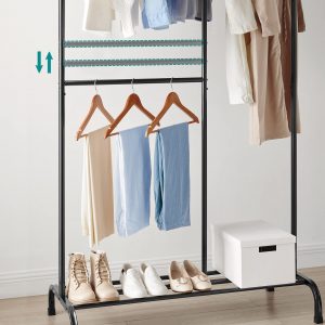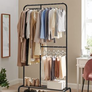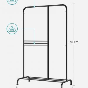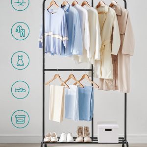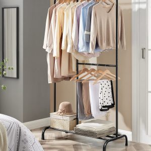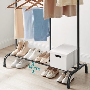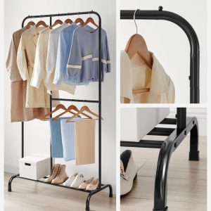 Almacenamiento Versátil: La barra superior puede soportar hasta 45 kg, perfecta para colgar abrigos y vestidos largos, mientras que la barra central soporta hasta 25 kg, ideal para chaquetas y camisas. El estante inferior puede sostener hasta 30 kg, útil para zapatos y cajas de almacenamiento.