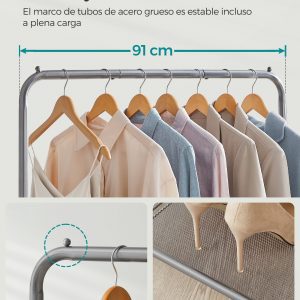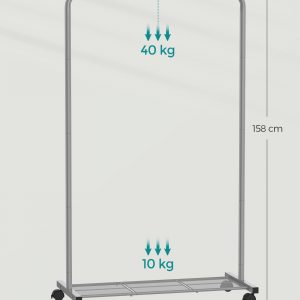 Optimiza el almacenamiento de tu ropa con este práctico y resistente perchero burro con ruedas. Con unas dimensiones de 40,5 x 91 x 158 cm, proporciona un amplio espacio para colgar hasta 40 camisas, haciéndolo ideal para expandir el espacio de tu armario. Su diseño resistente y duradero, con tubos de acero y un estante de malla inferior, garantiza un soporte estable para tu ropa pesada y accesorios adicionales.