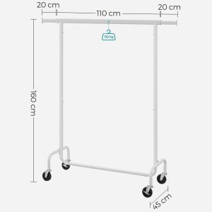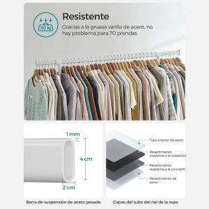 Este perchero de diseño robusto es perfecto para colgar abrigos, chaquetas y una variedad de prendas. Gracias a los tubos de acero de 1 mm de grosor y a las ruedas industriales de PP de alta resistencia, este perchero puede soportar hasta 130 kg, asegurando una excelente capacidad de carga.