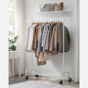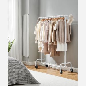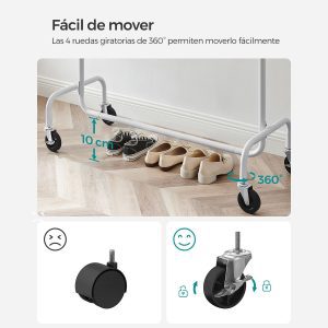 Equipado con 4 ruedas que giran 360°, de las cuales 2 son bloqueables, este perchero es fácilmente trasladable de una habitación a otra. Además, puedes bloquear las ruedas para mantener el perchero fijo y estable cuando sea necesario.