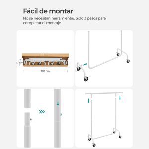 El montaje de este perchero es sencillo y se puede realizar en solo 3 pasos, sin necesidad de herramientas. Su diseño permite desmontarlo rápidamente, facilitando su almacenamiento en un rincón para ahorrar espacio cuando no esté en uso.