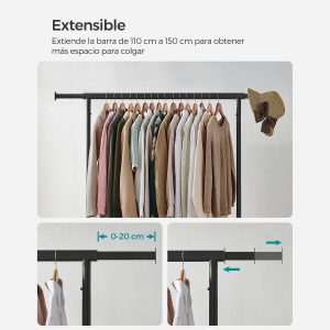 Las barras retráctiles en los laterales del perchero se pueden extender hasta 20 cm (longitud de la barra superior: 110-150 cm), proporcionando espacio adicional para colgar. Son ideales para organizar bolsos, sombreros, bufandas y otros accesorios, maximizando la utilidad del perchero.