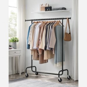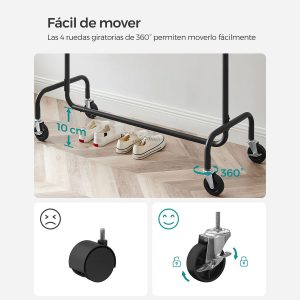 Equipado con 4 ruedas que giran 360°, de las cuales 2 son bloqueables, este perchero es fácilmente trasladable de una habitación a otra. Además, puedes bloquear las ruedas para mantener el perchero fijo y estable cuando sea necesario.