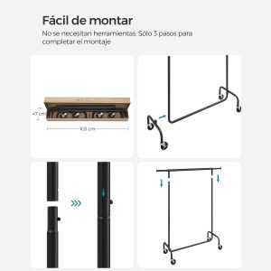 El montaje de este perchero es sencillo y se puede realizar en solo 3 pasos, sin necesidad de herramientas. Su diseño permite desmontarlo rápidamente, facilitando su almacenamiento en un rincón para ahorrar espacio cuando no esté en uso.