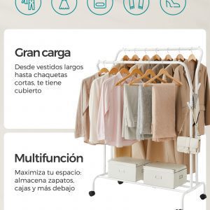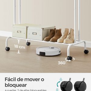 Equipado con 4 ruedas universales, este perchero se puede mover fácilmente a cualquier lugar. Dos de estas ruedas son bloqueables, lo que permite fijar el perchero en un lugar específico para mayor estabilidad.