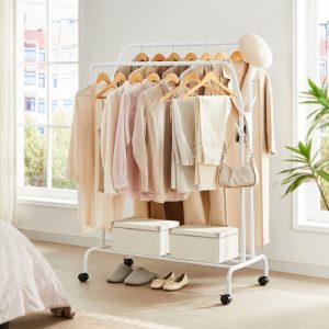 Este tendedero multifuncional es una solución ideal para colgar y secar la ropa en tu hogar. Con varillas altas y bajas, ofrece espacio para prendas de distintas longitudes, mientras que los ganchos en ambos lados son perfectos para colgar bolsos y sombreros. Además, el estante inferior proporciona espacio adicional para guardar cajas, zapatos y otros artículos.