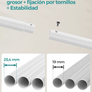 El burro de ropa cuenta con un tubo de acero de 25,4 mm de grosor que garantiza una estructura estable y resistente, con una capacidad máxima de carga de 110 kg distribuida entre las barras, ganchos y estante.