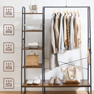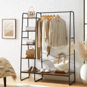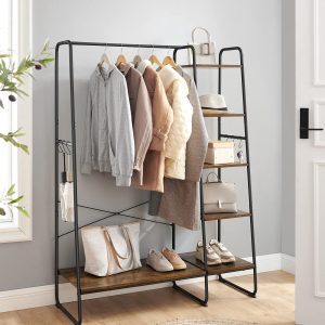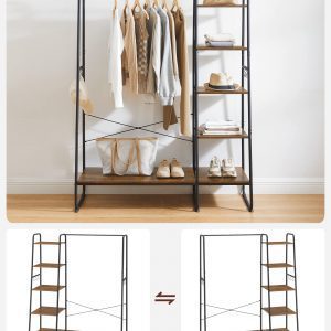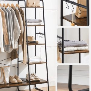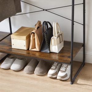 Diseño Multifuncional: Incluye múltiples opciones de almacenamiento como una barra para colgar, estante para zapatos, cinco estantes y seis ganchos, ideal para organizar diversos artículos en un solo lugar.