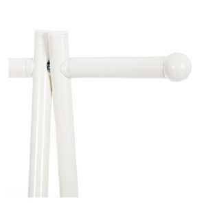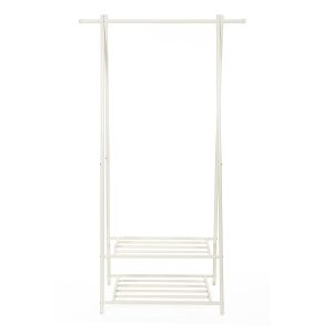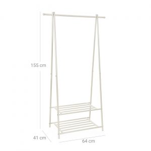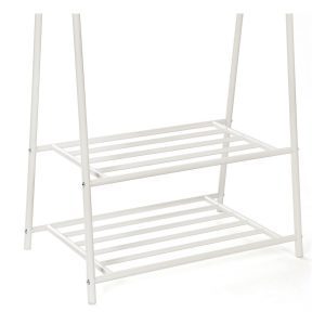 Estructura Sólida y Estable: Construido con tubos de metal en una configuración triangular, nuestro perchero garantiza una firmeza y durabilidad excepcionales. Equipado con baldas tubulares y pies con tapones de plástico, protege tu suelo de posibles rayaduras.