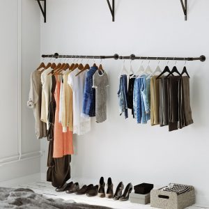 Este soporte de ropa de pared no solo añade un toque industrial a tu espacio, sino que también resuelve problemas de almacenamiento en habitaciones pequeñas. Con un diseño robusto y versátil, este soporte es ideal para colgar una variedad de prendas sin ocupar demasiado espacio.