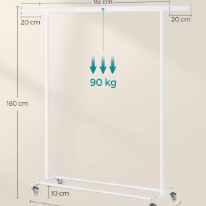 Capacidad de Carga Mejorada: Construido con tubos de acero de 1 mm de grosor y equipado con ruedas industriales de PP de alta resistencia, este perchero soporta hasta 90 kg, ideal para colgar abrigos y chaquetas pesadas con total seguridad.
