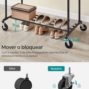 Movilidad Sencilla: Gracias a sus 4 ruedas universales, dos de ellas bloqueables, puedes mover el perchero a donde lo necesites, ya sea del dormitorio al armario o a cualquier otro lugar.