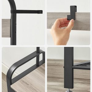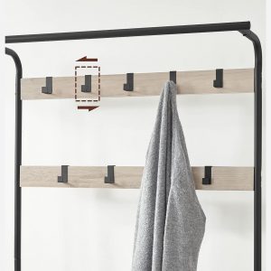 Barra Colgante y Ganchos Resistentes: La barra superior proporciona espacio adicional para colgar, mientras que los 9 ganchos de metal antioxidante se ajustan fácilmente para acomodar tus bolsos, sombreros o abrigos, garantizando durabilidad y adaptabilidad.